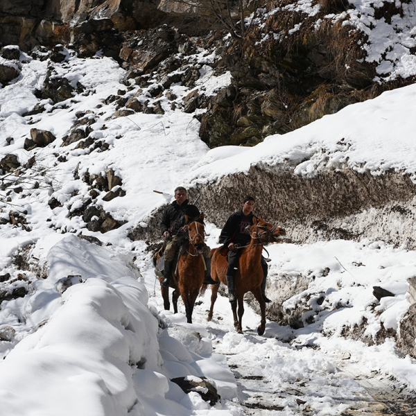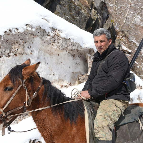 ცხრაკილომეტრიანი გზის ნახევარზე ცოტა მეტი ვიარეთ მანქანით და მერე ნაზვავს მივადექით. ის იყო ზურგჩანთები და კამერები მოვიმარჯვეთ და გზას ფეხით შევუდექით, რომ გზად ცხენებით მომავალი მამა-შვილი დავითი და გიგლა შემოგვხვდნენ. თან ნიჩბები ჰქონდათ წამოღებული და გზის გაწმენდას აპირებდნენ. სამუშაო შევუფერხეთ.