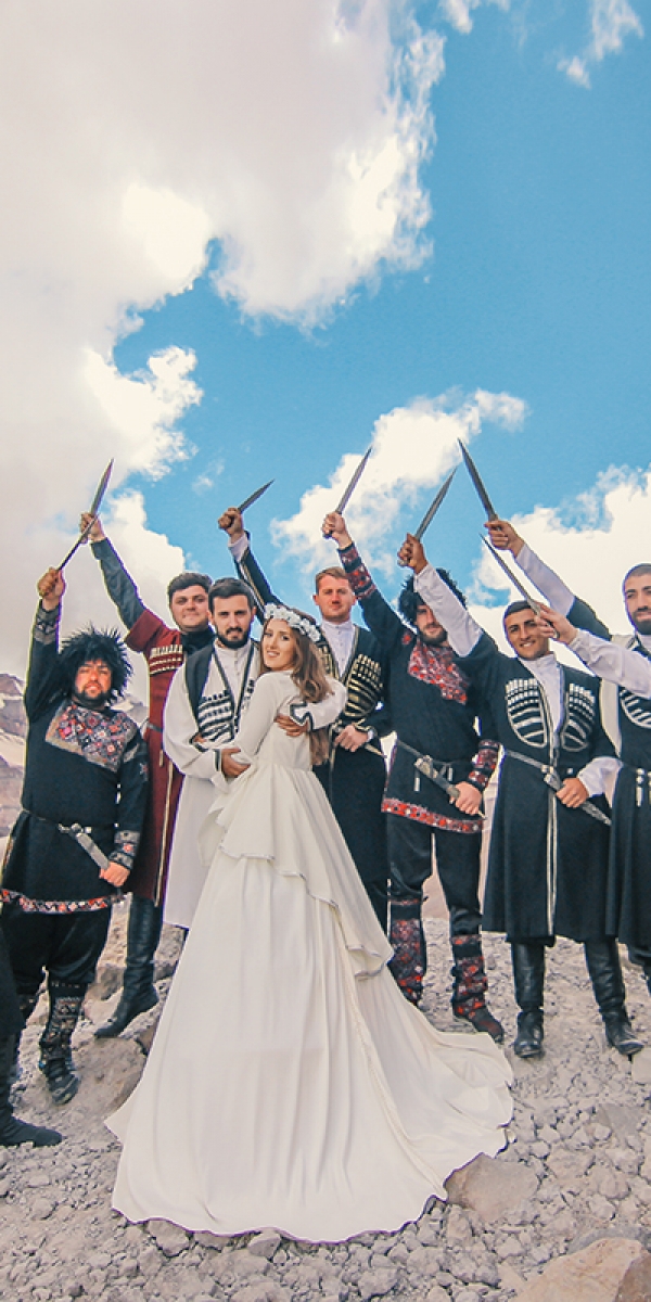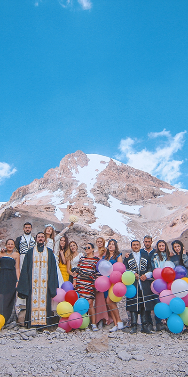 ნეფე-დედოფალი. 33 კაციანი მაყრიონი ზურგზე აკიდებული 25 კილოგრამიანი ტვირთით. მღვდელი და გადამღები ჯგუფი. ზღვის დონიდან 4000 მეტრზე მდებარე ტაძარი და ასრულებული ოცნება - ჯვრისწერა მყინვარწვერზე!