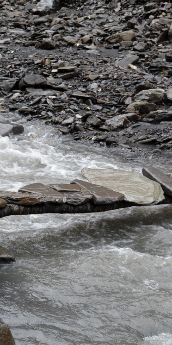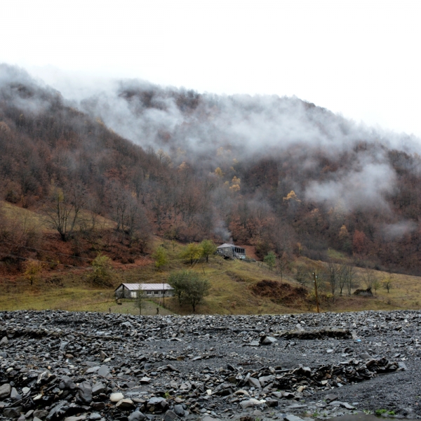 მანქანას ვტოვებთ და ფეხით მივდივართ. სახლი გამოჩნდა. მასთან მისასვლელად წვიმიან ამინდში ცივ მდინარეში მოგვიწევს გასვლა. კალაპოტს აღმა მივუყვებით. საბედნიეროდ, მდინარეზე პატარა „ხიდია“ გადებული - ხის ორ მორზე რიყის დიდი ქვებია დაწყობილი.