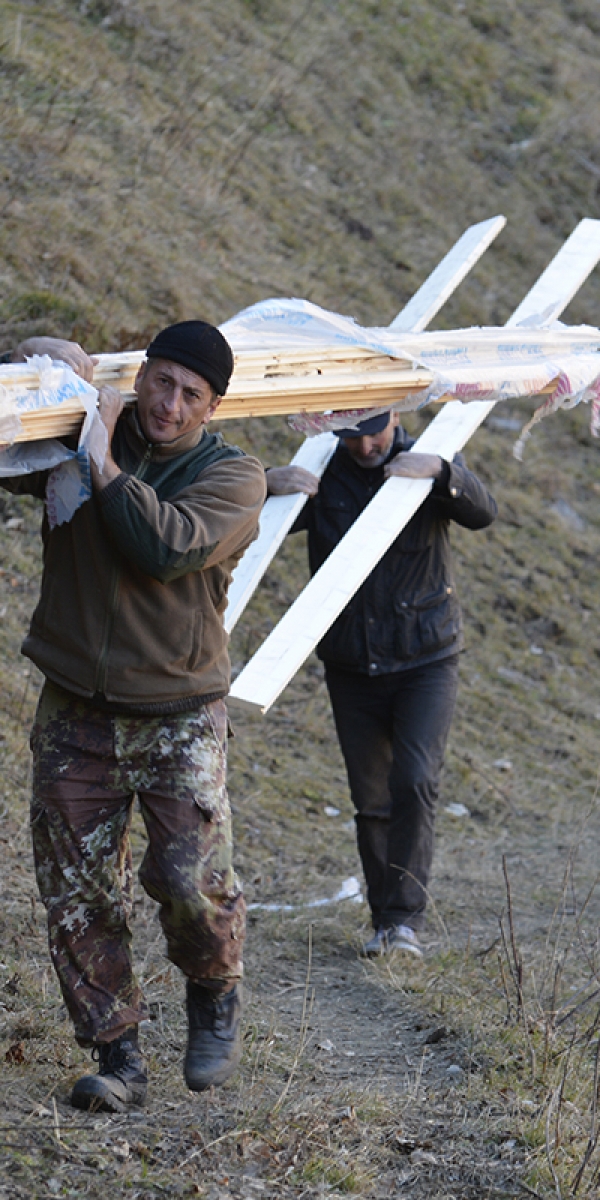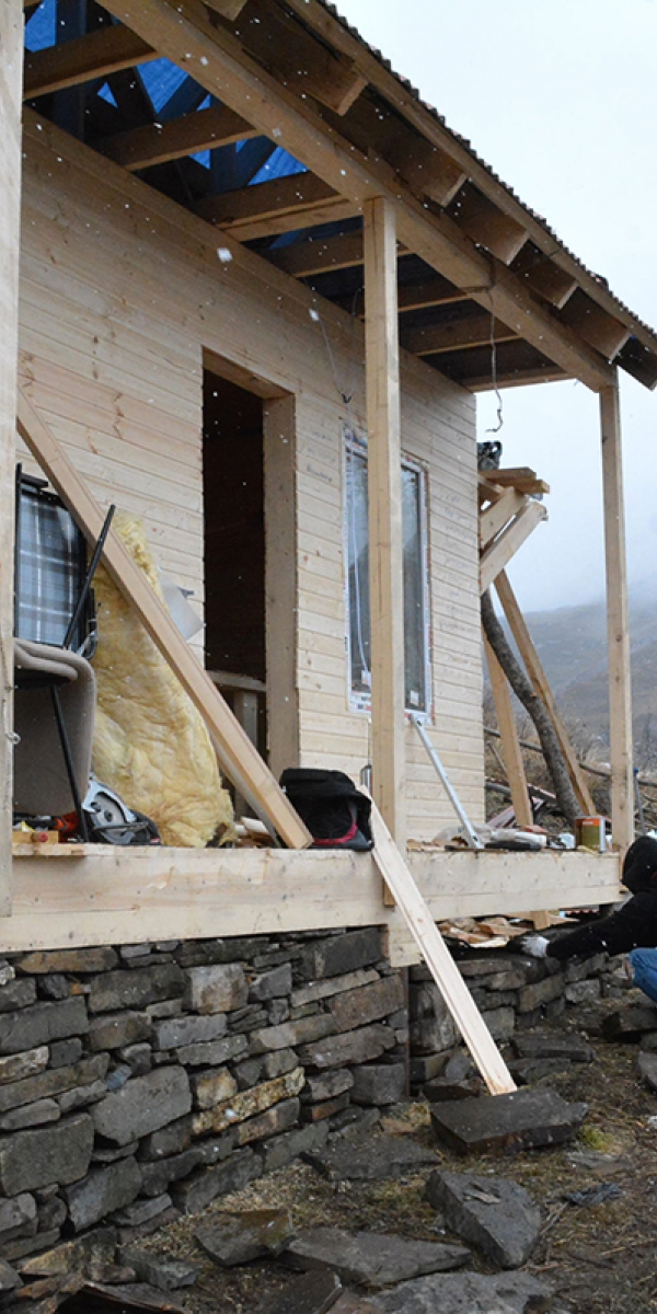 15 კვმ ხის სახლის მშენებლობა კომპანიას „ხის კოტეჯები“ შევუკვეთეთ. თბილისიდან ბარისახომდე სამშენებლო მასალების ტრანსპორტირება დუშეთის მერიამ უზრუნველყო, ბარისახოდან ზეისტეჩომდე კი სასაზღვრო პოლიციამ, ვერტმფრენით. მიხა პაპას მიწურამდე მასალების ატანის და მშენებლობის პროცესში ახალგაზრდები დაგვეხმარნენ.
