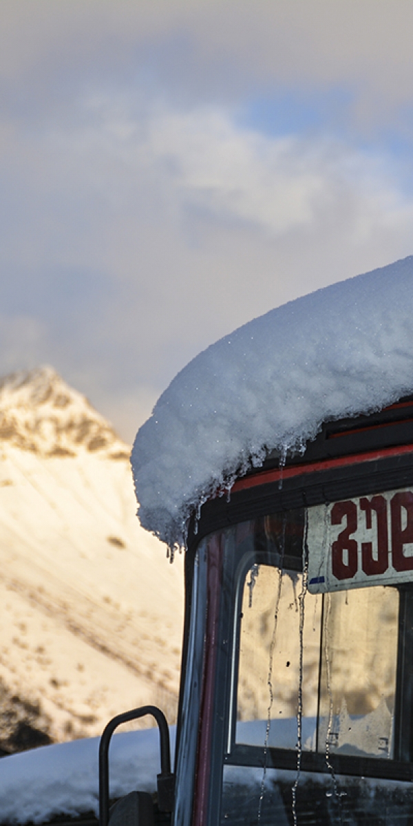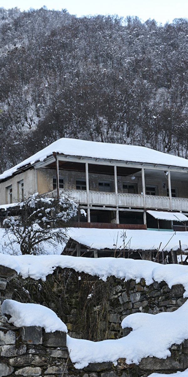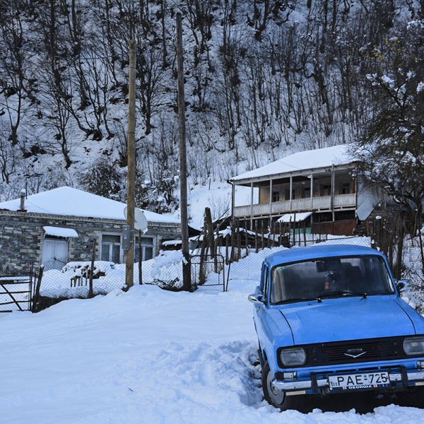 ერთ სახლში აივანზე გაფენილი სარეცხი დავინახეთ. ეს ნიშანია, რომ აქ ცხოვრობენ, ჯერ ზემოთ ავალთ, მერე აუცილებლად ჩამოვივლით ამ ოჯახში, ვფიქრობთ. მანქანას კი სწორედ აქ ვაჩერებთ, რადგან წინ სატვირთო მანქანაა გაჭედილი: სამი ადამიანი ჯაჭვებს უნაცვლებს, რომ როგორმე ზემოთ ავიდეს. გზა მოყინულია, თან გვერდის ავლასაც ვერ შევძლებთ.
