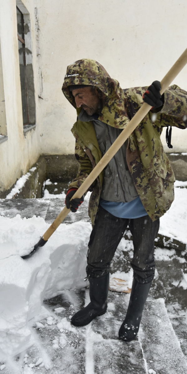 გარეთ ხვავრიელად ბარდნის. დარაჯი კიბეს თოვლისგან წმენდს.