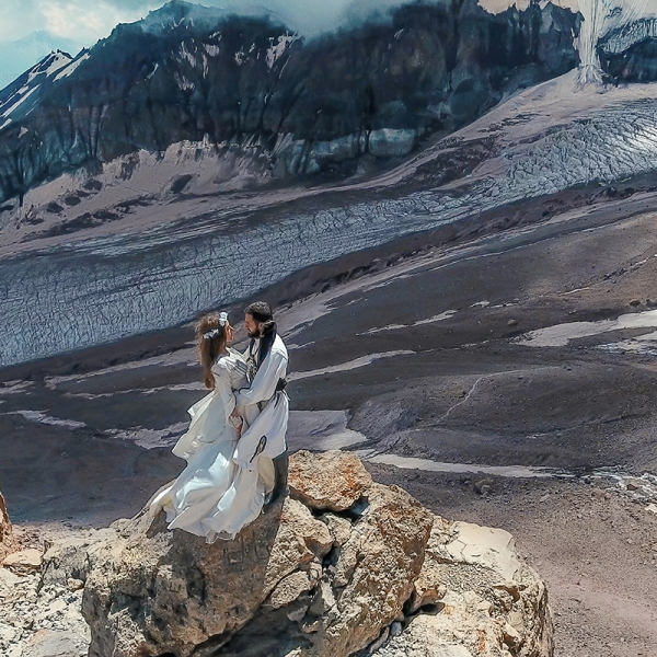 ნეფე-დედოფალი. 33 კაციანი მაყრიონი ზურგზე აკიდებული 25 კილოგრამიანი ტვირთით. მღვდელი და გადამღები ჯგუფი. ზღვის დონიდან 4000 მეტრზე მდებარე ტაძარი და ასრულებული ოცნება - ჯვრისწერა მყინვარწვერზე!